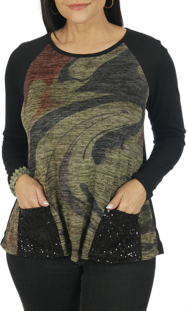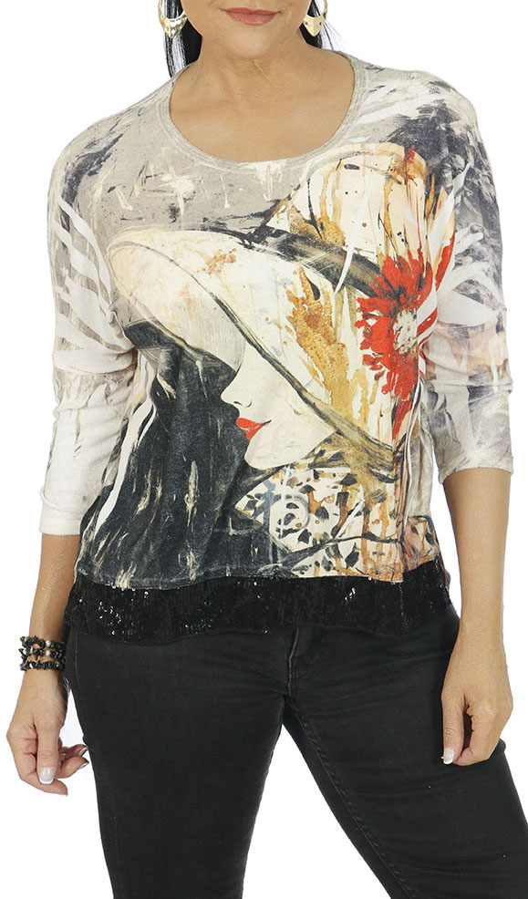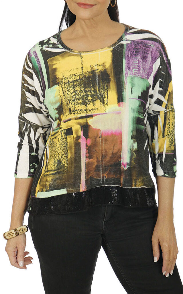 Drop shoulder w/black sequin on the hemline